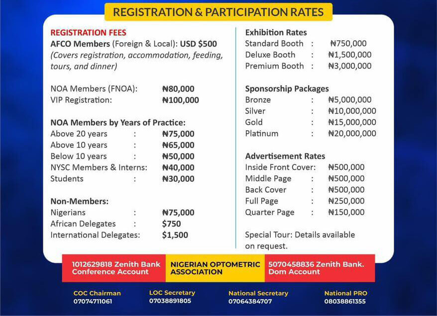 This 2026 Conference/49th and AFCO AGM offers a platform for Optometrists and scientists from academia, industry, and government to discuss Optometry and the Optometrist in a Changing World. The fee schedule for this epic event is captured below:
